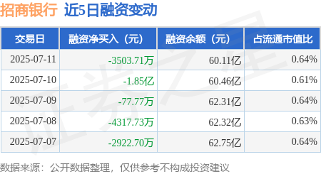 本站消息,7月11日,招商银行(600036)融资买入3.21亿元,融资偿还3.56亿元,融资净卖出3503.71万元,融资余额60.11亿元。